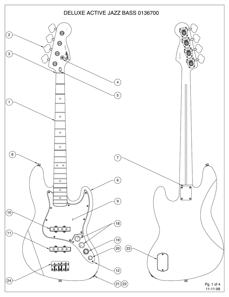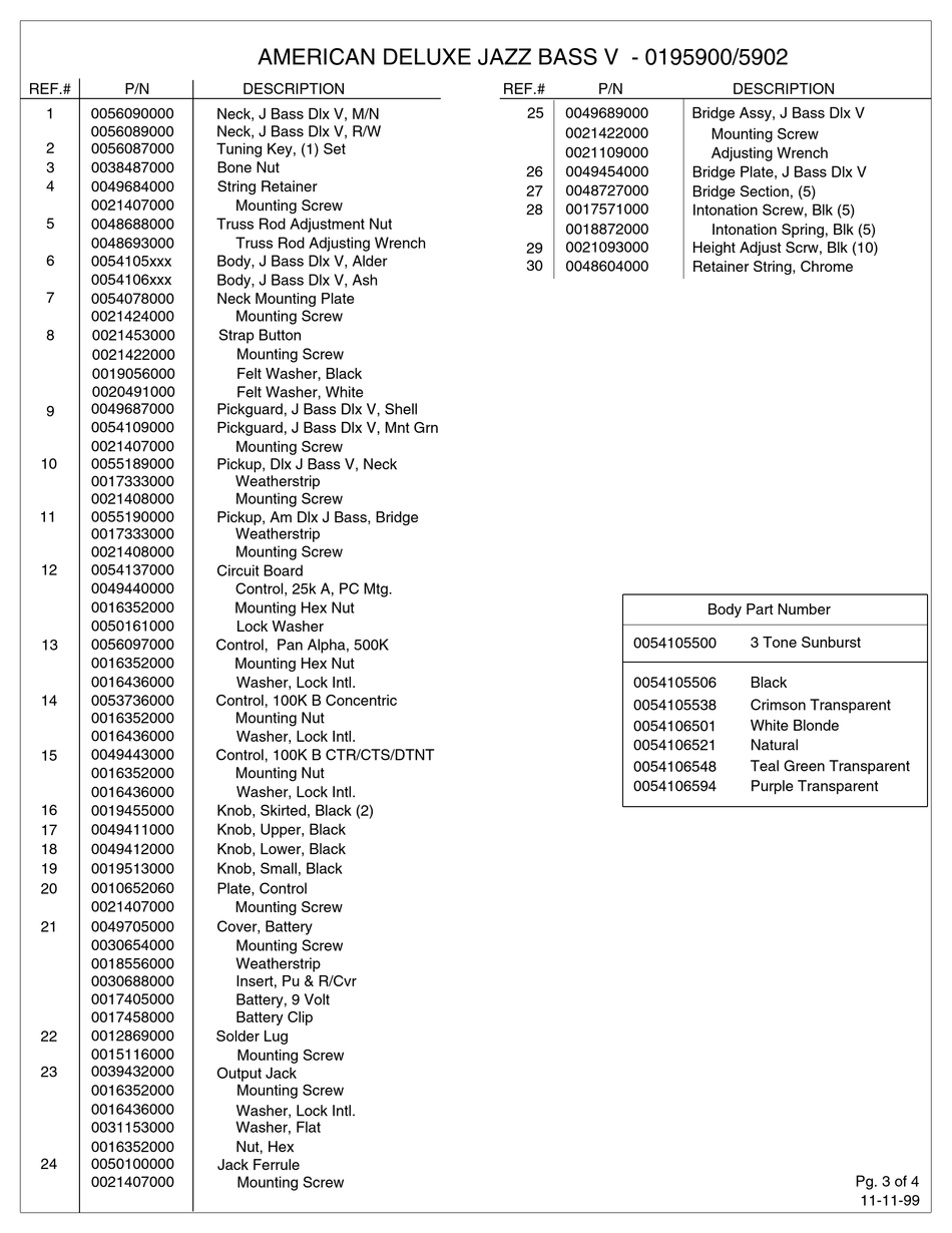 A copyright - 2016 - fender musical instruments corporation parts list ref description part number 1 body am elite j-bass 3ts 7708050500 1 body am elite j-bass owt 7708493505 1 body am elite j-bass blk 7708493506 1 body am elite j-bass nat 7708364521 1 body am elite j-bass tbs 7708364552 2 neck assy am elite j. Fender American Deluxe Jazz Bass V Assembly 1 pages. Below is the list of all documents avaialble at NoThickManuals regarding the device Fender American Deluxe Jazz Bass.